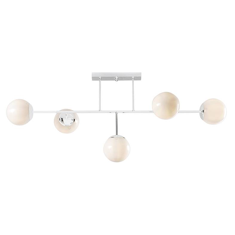 Struktur aus verchromtem Metall oder in Mattweiß oder Schwarz, mit fünf omnidirektionalen Lichtpunkten mit milchweißen Glaskugeln für diffuses, homogenes und einhüllendes Licht.