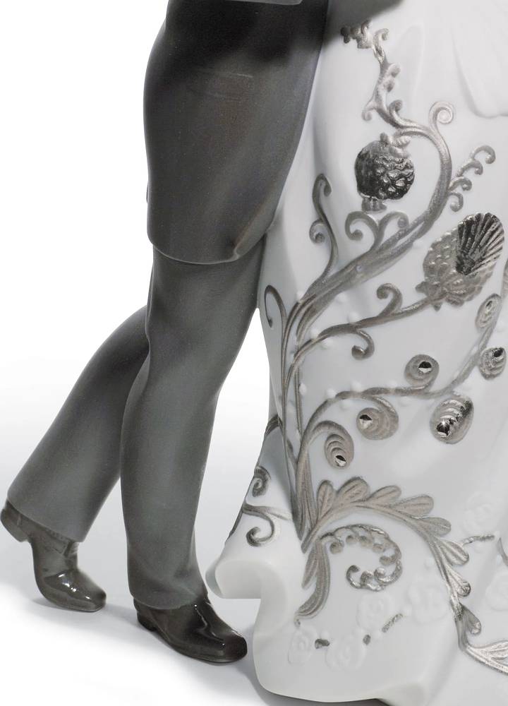 This romantic bride and groom couple takes on a much more contemporary style due to the contrast between the matte finish of the white porcelain and the shine of the silver embroidery that enhances the beautiful dress and other details.